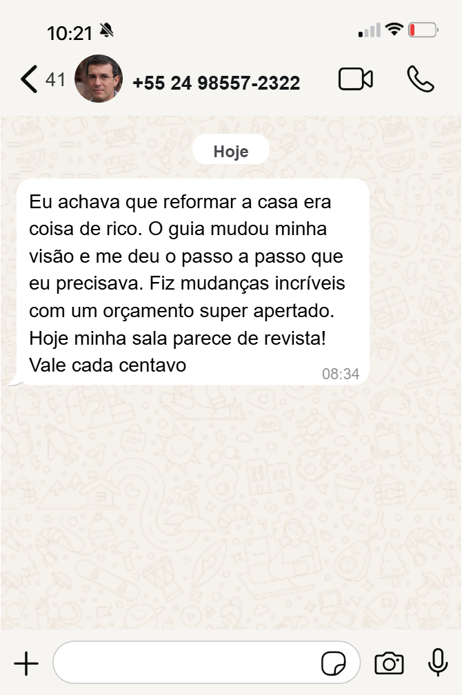Tudo o que você precisa fazer é seguir o passo a passo de quem realmente entende os desafios de reformar com pouco investimento e com o mínimo de dor de cabeça!